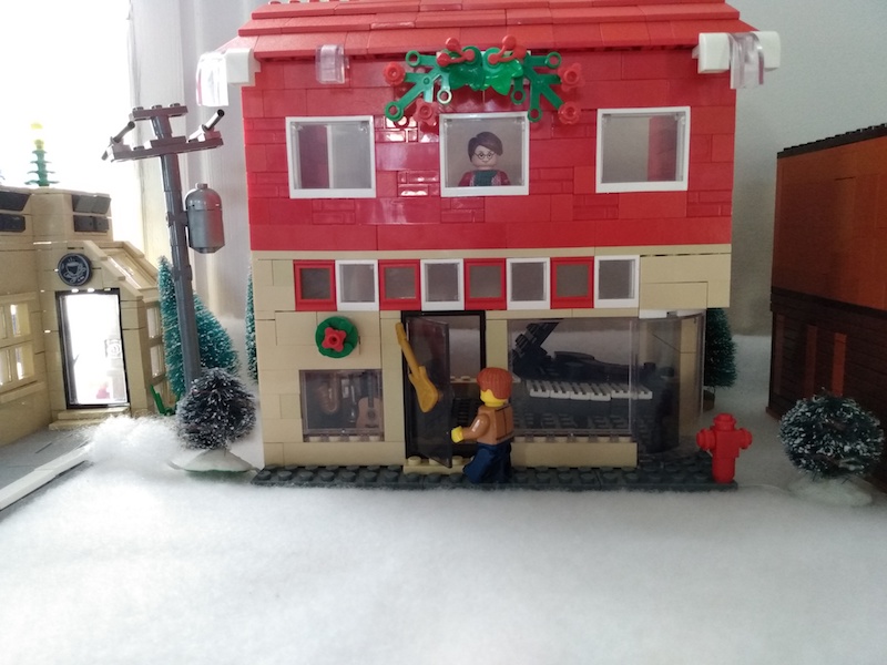 Here's the town's music store designed and built by me. I have no idea who lives above the shop or who is going inside, but notice the grand piano in the window and the other instruments in the other window.